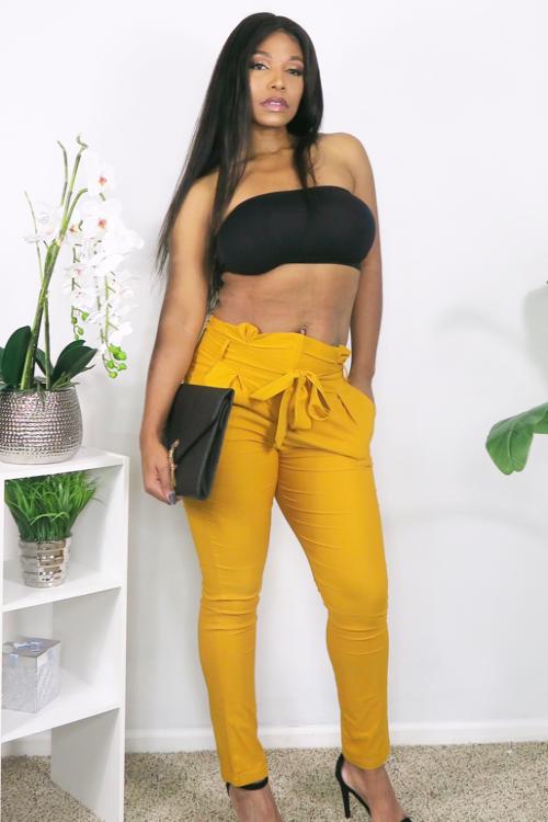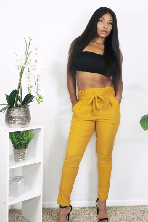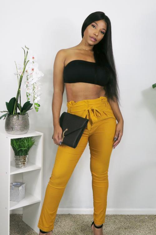 Chic and flattering high-waisted pants in a vibrant mustard color , featuring a front tie detail for a stylish and elegant look.