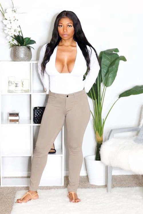 Essential everyday soft fitted tan pants, crafted from stretchy fabric for comfort, flexibility, and a flattering fit.
