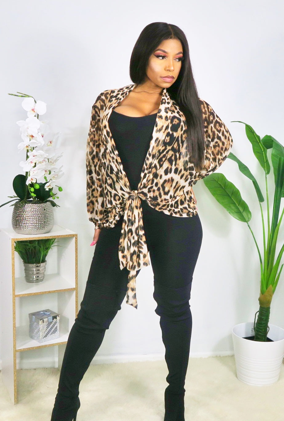 Bold and playful leopard-print mesh top that ties at the front, offering a flirty, statement-making look with a hint of edge.